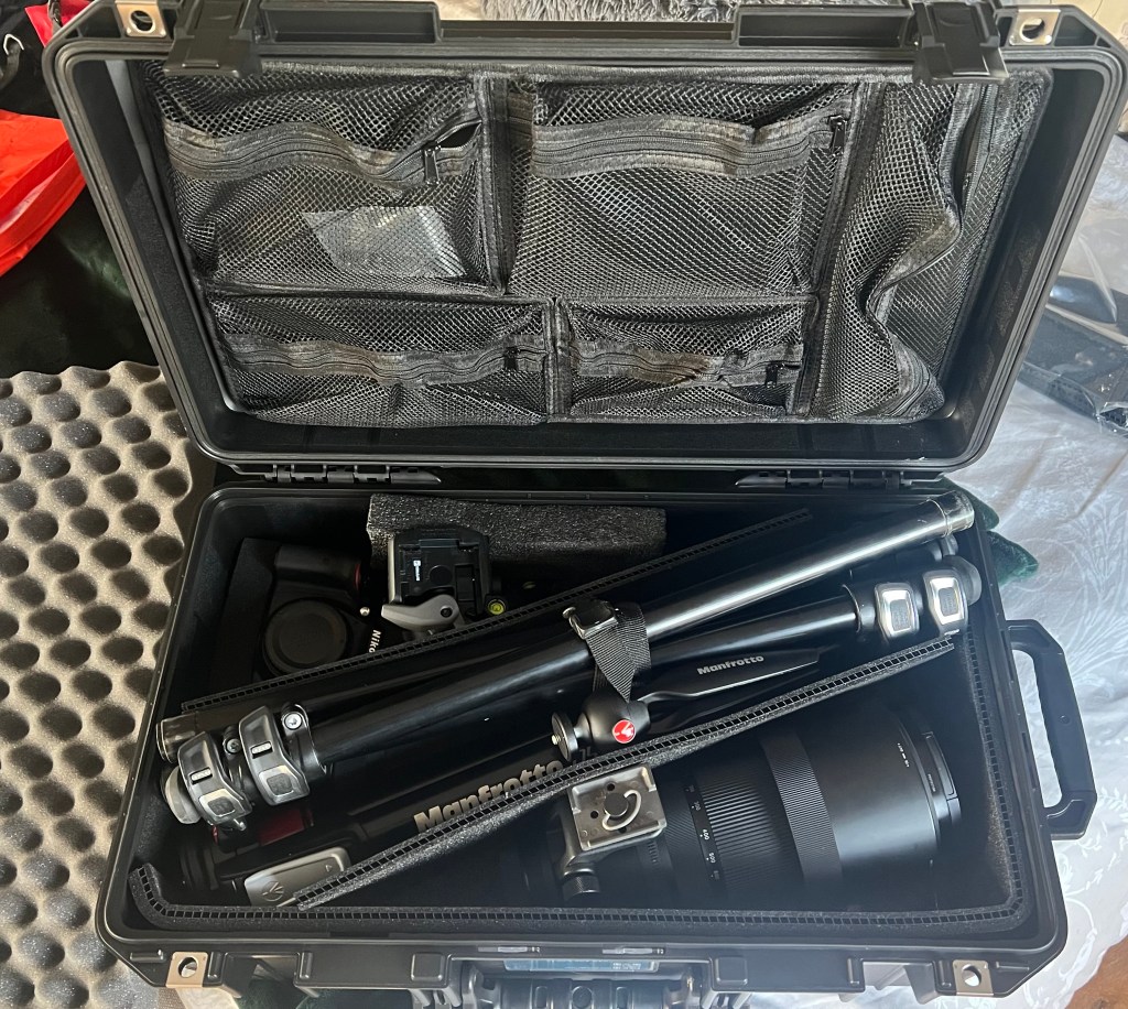 All of this kit needs to be transported safely (especially the 600mm lens) so I’m using a Peli 1535 Air, which is basically the old 1510 but only 40% of the weight. Here’s how it looks at the moment. I’ll pack socks and so forth around all the spaces using dry bags with the air sucked out. They make great foam inserts!